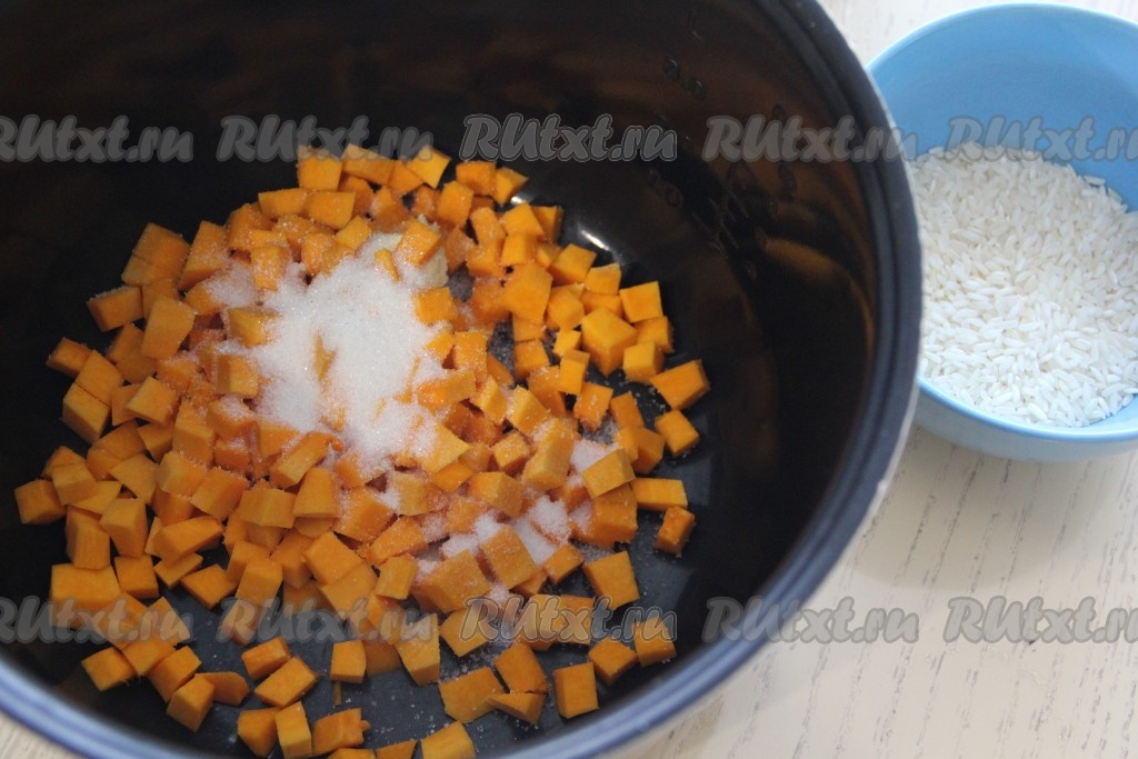 В чашу с рисом, тыквой и маслом влить молоко любой жирности. Поместить чашу в мультиварку. Чтобы молоко не убежало, поставить сверху поддон для пароварки. Закрыть крышку мультиварки.