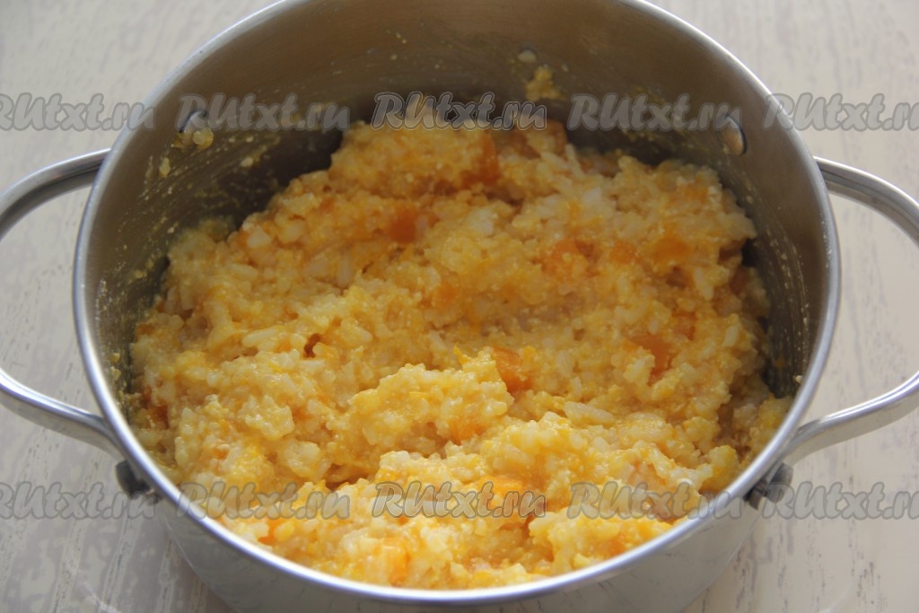 Выставить режим мультиварки "Молочная каша", время - 25 минут. После звукового сигнала в рисовую кашу с тыквой добавить сливочное масло и перемешать. Готовую кашу я переложила из чаши в кастрюлю, так как мне мультиварка понадобилась для приготовления другого блюда.