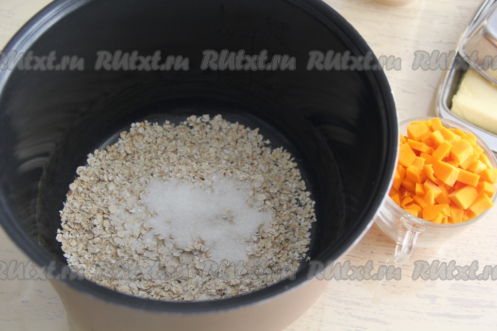 В чашу мультиварки всыпать овсяные хлопья, соль и сахар.