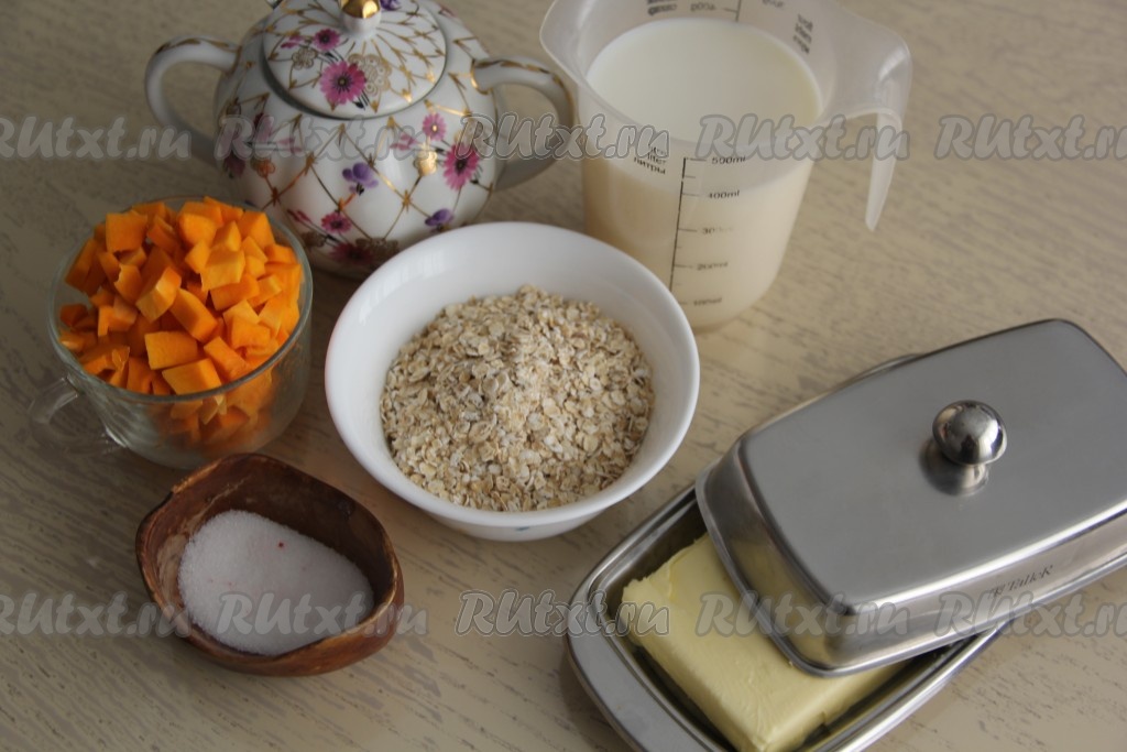 Подготовить продукты. 150 грамм очищенной тыквы нарезать на кубики среднего размера. В отдельной ёмкости соединить молоко и воду.