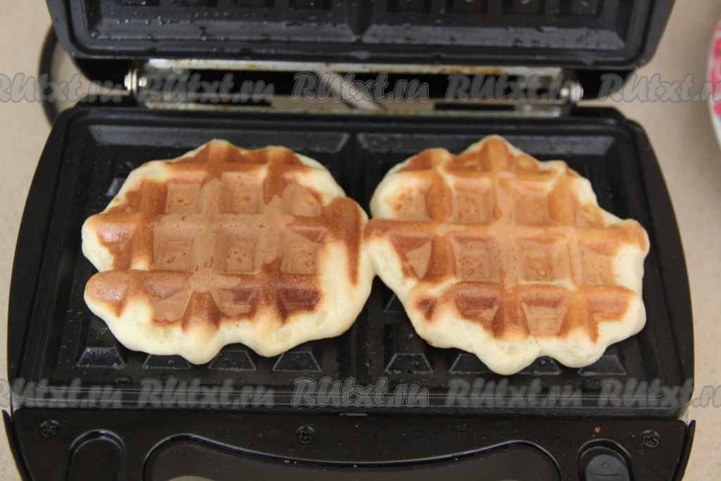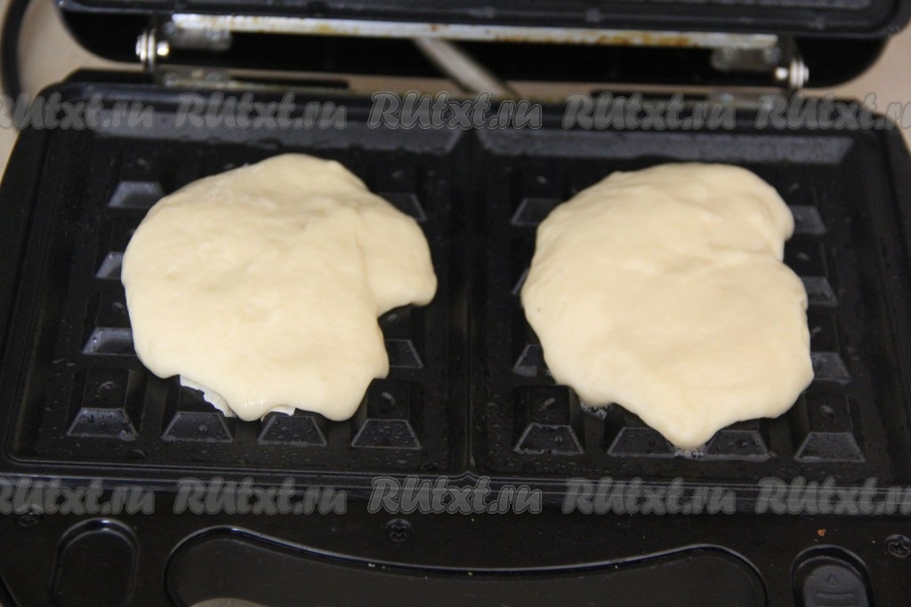 Электровафельницу хорошо разогреть, затем смазать её панели небольшим количеством растительного масла. Выкладывать на каждую панель вафельницы по 1 столовой ложке теста (то есть для выпечки 1 вафли нужно выкладывать 1 столовую ложку теста) и сразу крышку закрыть.