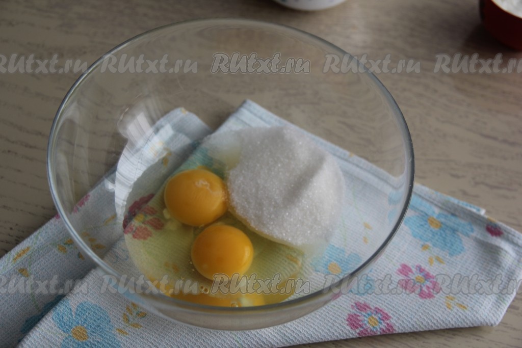 Вбить яйца и всыпать сахар в глубокую миску, удобную для замешивания теста.