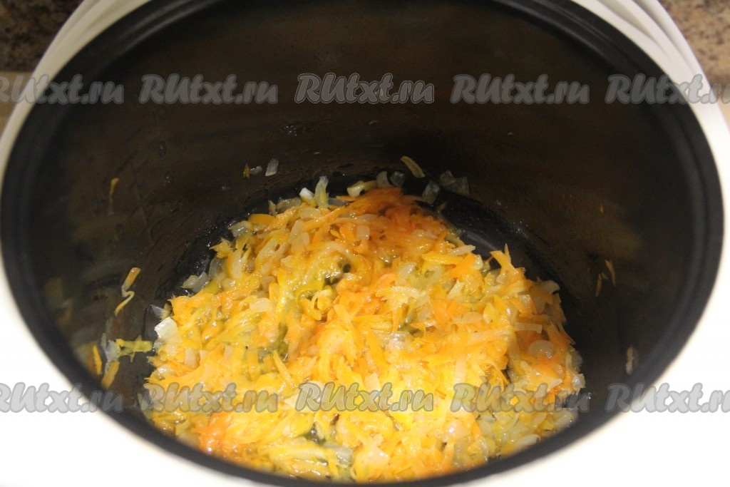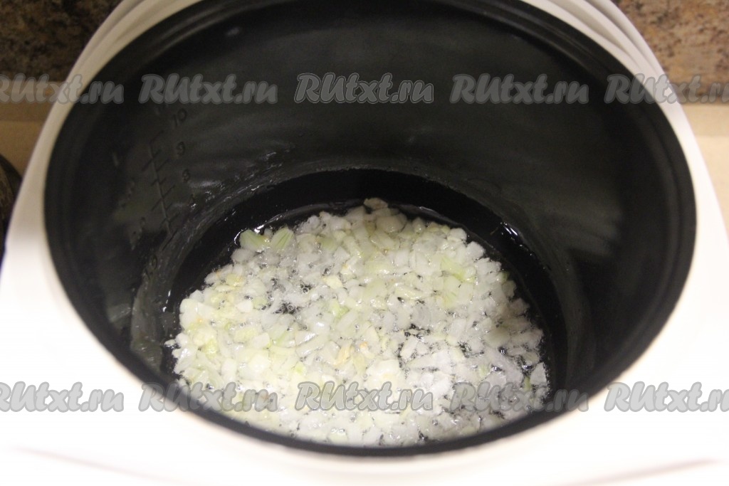 Выставить режим мультиварки "Жарка" и обжарить лук в течение 5 минут, периодически помешивая.