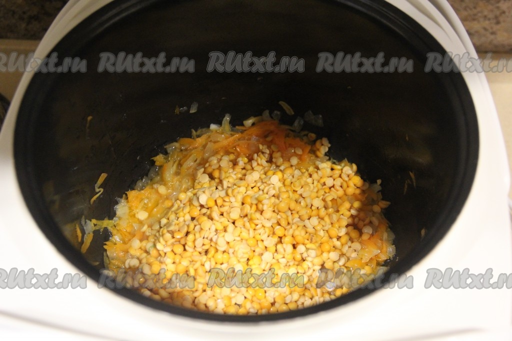 Колотый горох предварительно промыть в холодной воде, а затем высыпать его в чашу мультиварки.