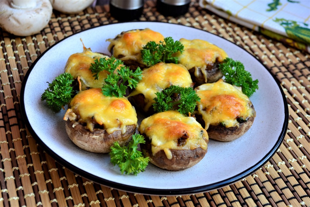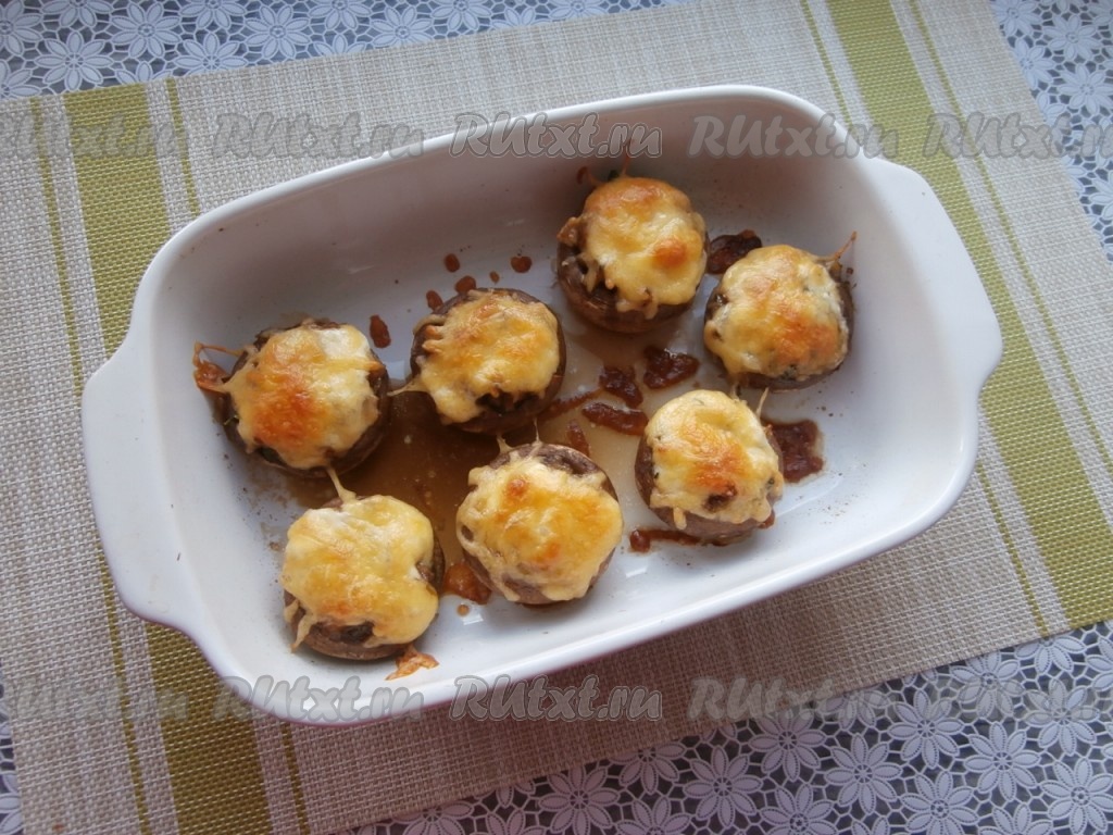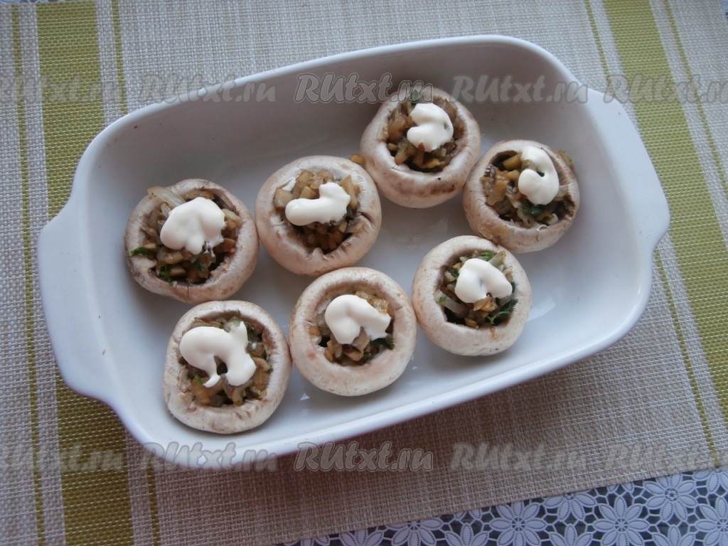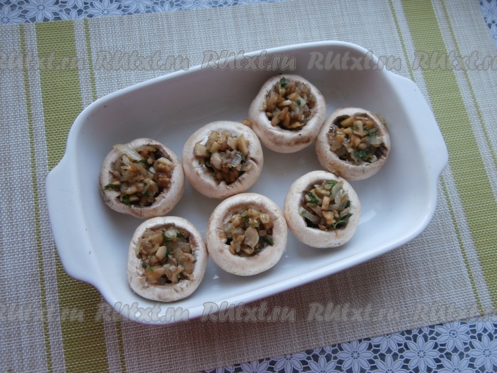 Далее шляпки шампиньонов наполнить слегка остывшими обжаренными ножками грибов с луком. Поместить фаршированные шляпки грибов в форму для запекания.