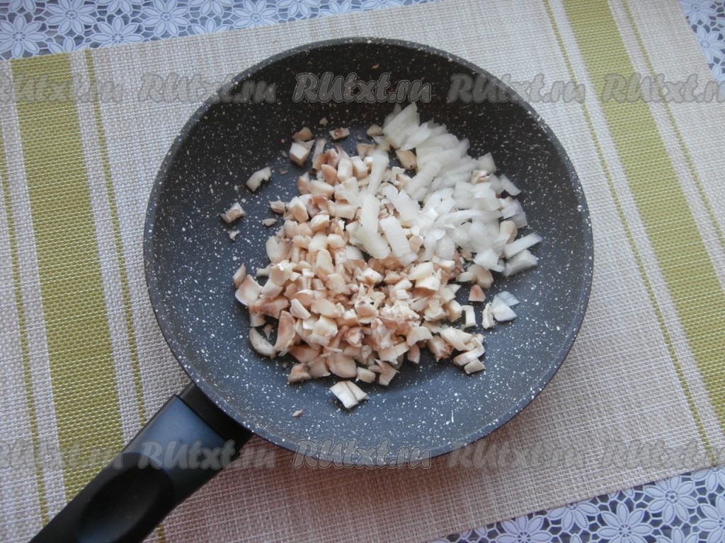 Ножки шампиньонов мелко нарезать, также мелко нарезать и очищенную луковицу. Ножки и лук поместить в сковороду с растительным маслом.