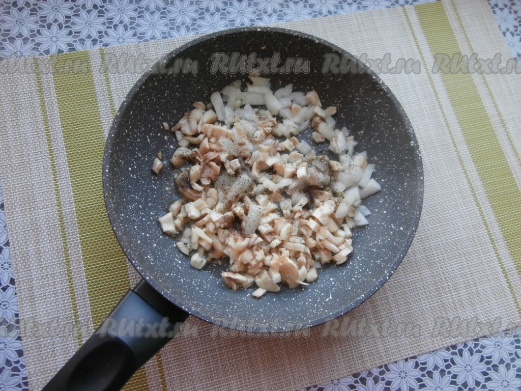 Обжарить грибочки с луком на среднем огне, помешивая, минуты 2-3.