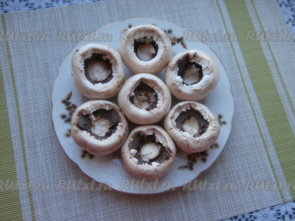 Удалить ножки, оставив шляпки для фаршировки. Шляпки внутри совсем чуточку посолить.