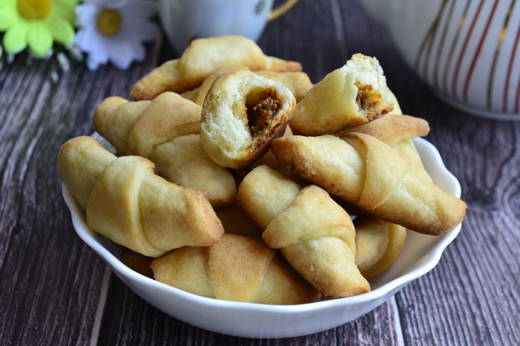 Выпечку остудить и можно подавать нежные, очень вкусные, немного рассыпчатые творожные рогалики с варёной сгущёнкой к семейному чаепитию.
