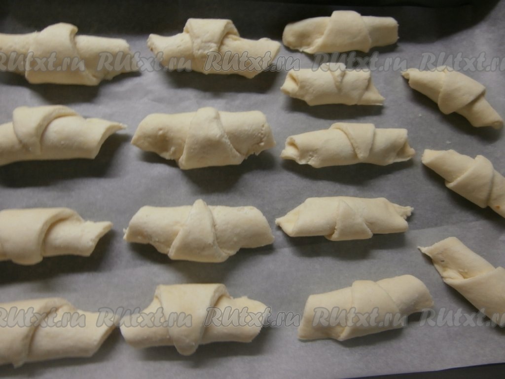 Разместить рогалики на противне, застеленном пергаментом, и отправить в духовку, разогретую до 180 градусов, минут на 30-35 минут (выпекать до румяности).