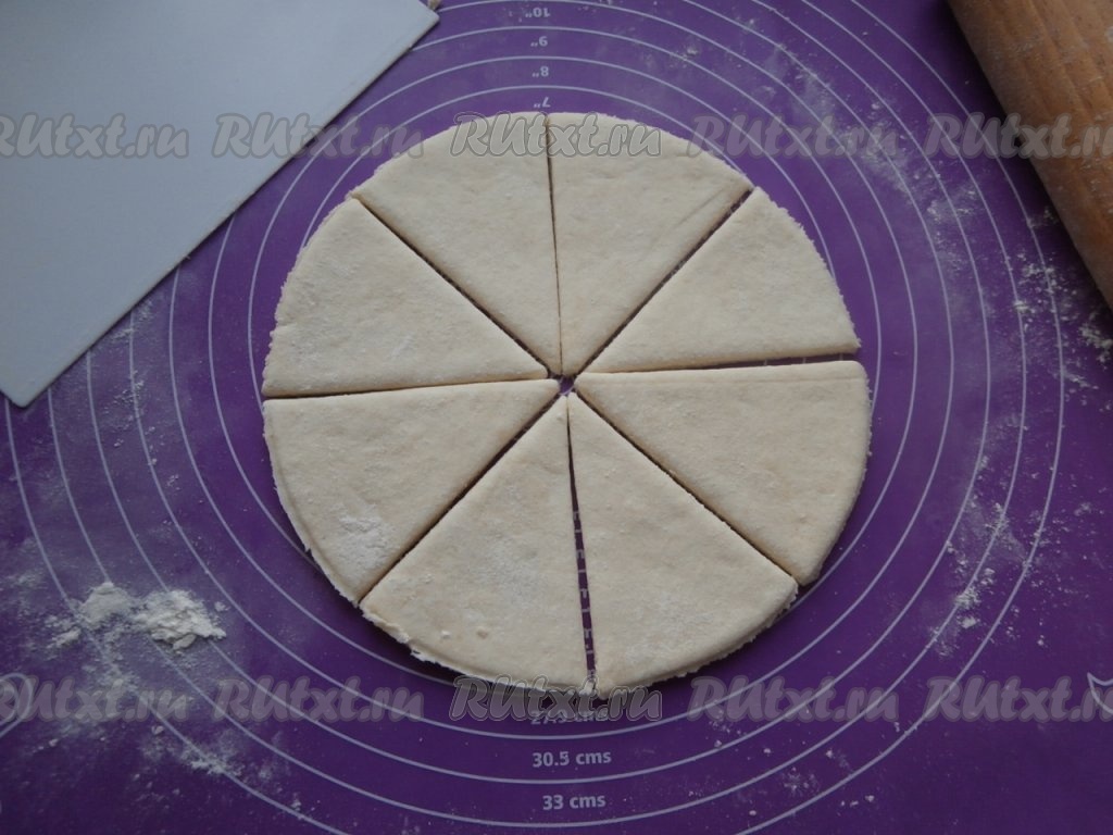Разделить тесто на 3 части. Каждую часть творожного теста на присыпанной мукой поверхности раскатать в круг толщиной около 0,5 см. Каждый круг разделить на 8 частей.