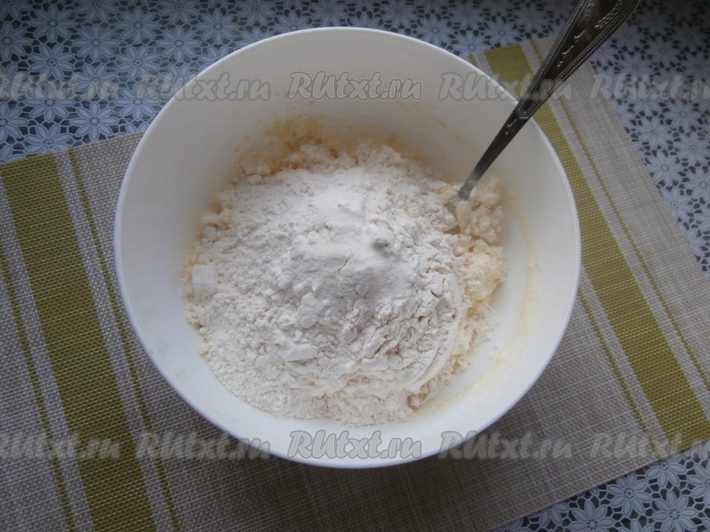 Сюда же всыпать ванильный сахар и сахар, перемешать, добавить муку с разрыхлителем, начать перемешивать вначале ложкой творожное тесто.