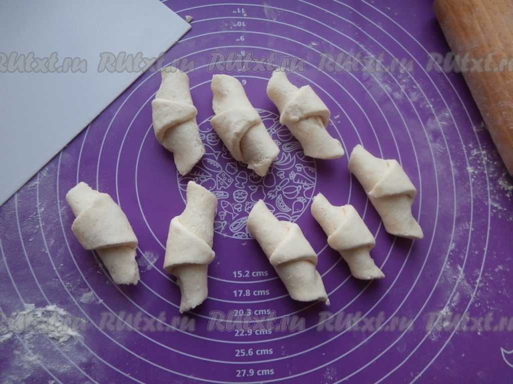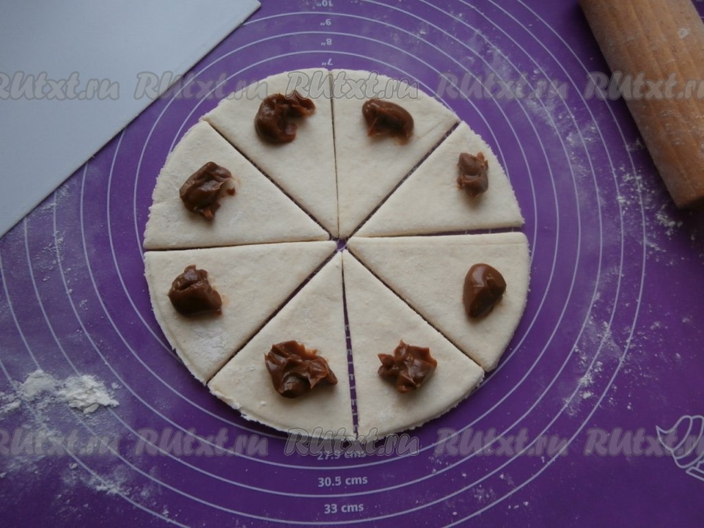 Свернуть каждый сектор, начиная с широкой стороны с начинкой, в рогалик. Всего получится 24 творожных рогалика с варёной сгущёнкой.