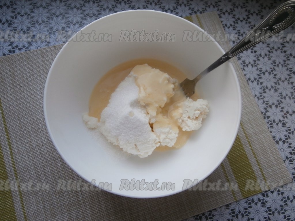 Сливочному маслу (или маргарину) дать согреться до комнатной температуры (или немного растопить, например, в микроволновке), а затем добавить в миску с творогом.