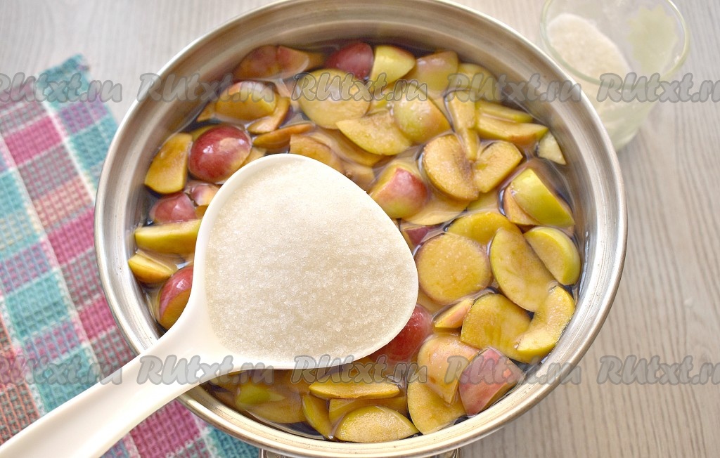 Сразу засыпаем сахар, перемешиваем. В зависимости от ваших вкусовых предпочтений и сладости используемых яблок, сахара можно добавить немного больше или меньше.