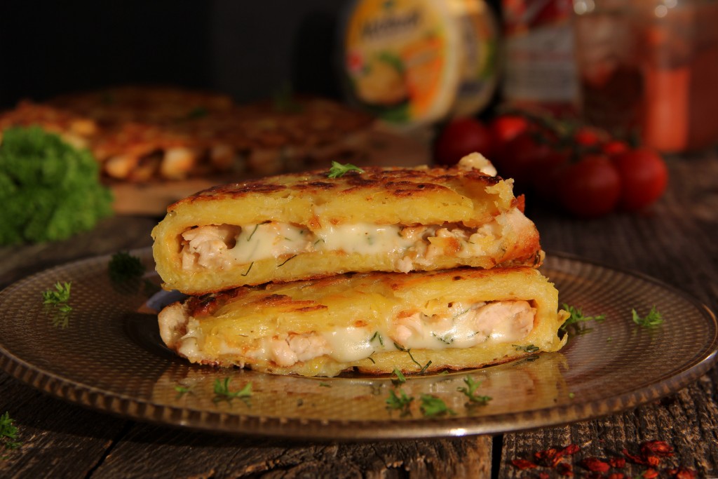Разрезать каждый драник пополам и подать к столу в горячем виде. Картофельные драники, приготовленные с начинкой из курицы и сыра на сковороде, получаются сытными и очень вкусными. Сыр в процессе обжаривания плавится и драник получается не сухим.