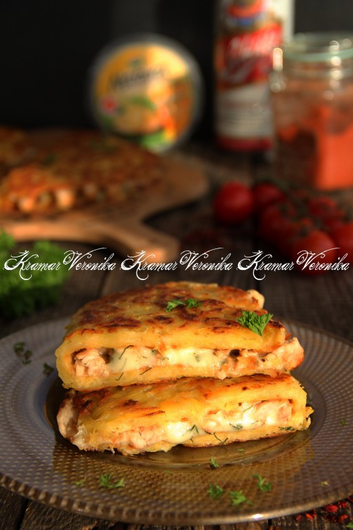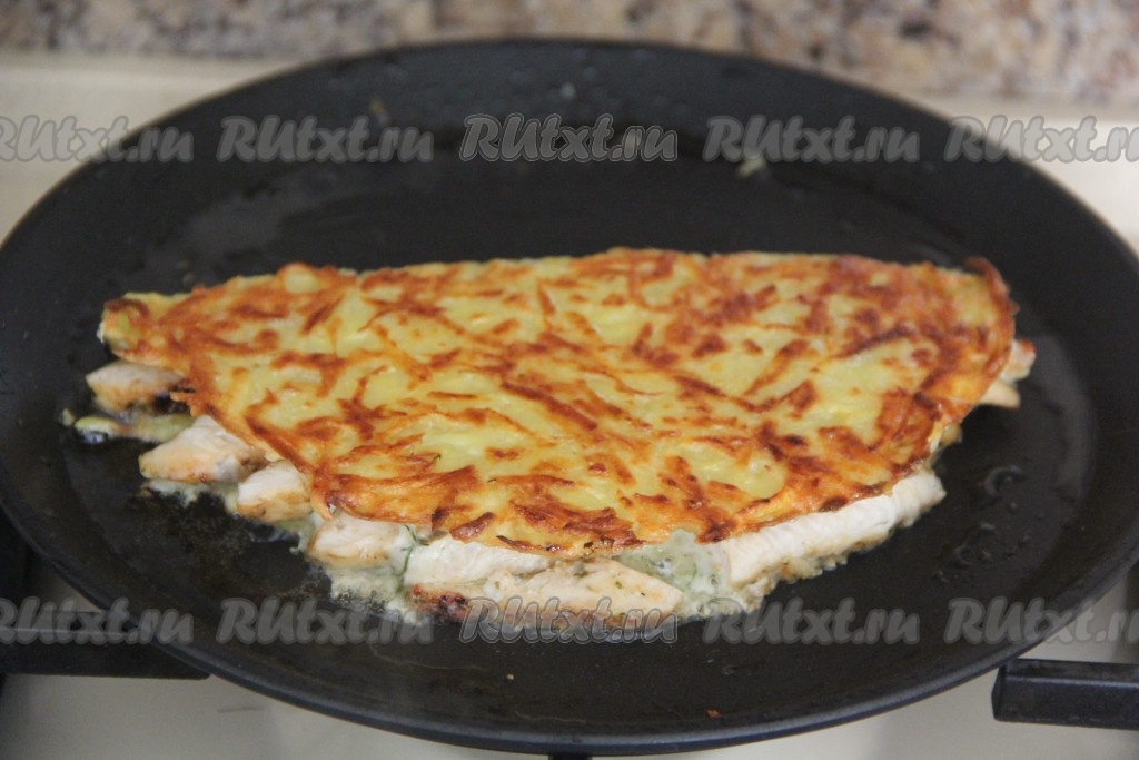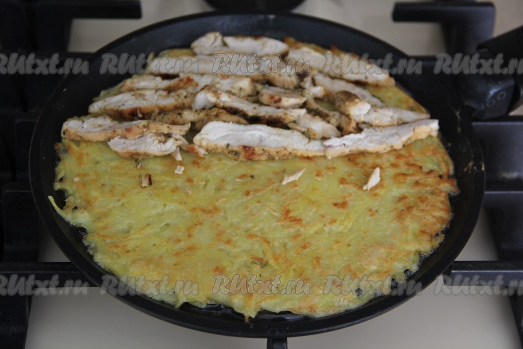 Обжаренную куриное мясо нарезать на достаточно тонкие пластинки. Как только перевернули драник, сразу выложить 1/3 нарезанного куриного филе на одну половину перевёрнутого драника.