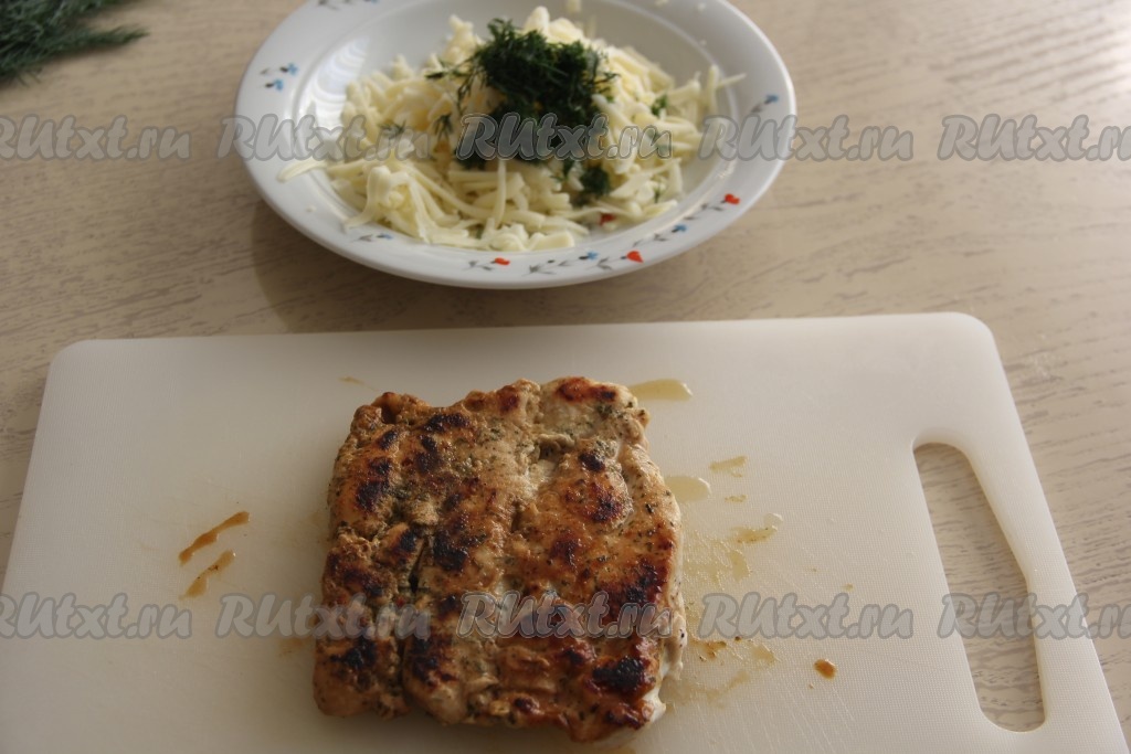 Куриное филе нарезать на пласты, посолить, приправить специями и выложить на сковороду, хорошо разогретую с небольшим количеством растительного масла, и обжарить с двух сторон на среднем огне до румяности. Я жарю куриное мясо с каждой стороны по 5 минут. Сыр натереть на тёрке, выложить в тарелку, добавить мелко нарезанный укроп (или другую зелень).