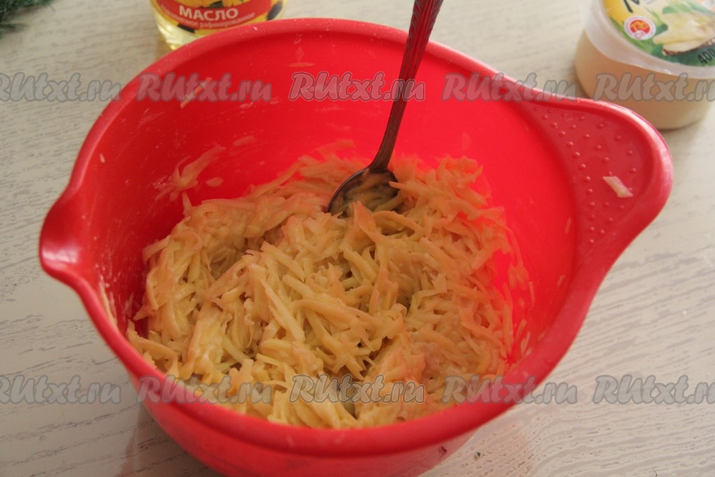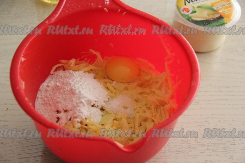 Отжать лишний сок с картофеля. А затем добавить к картошке яйцо, соль и муку.