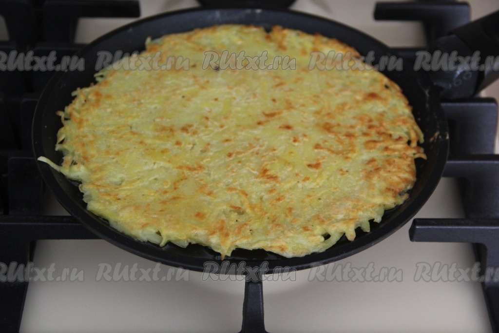 Жарить драник на среднем огне до золотистого цвета с одной стороны, затем перевернуть с помощью лопатки на вторую сторону (если блинчик будет плохо переворачиваться, переверните его тогда вначале на плоскую тарелку, а затем золотистой стороной вверх переложите на сковороду).
