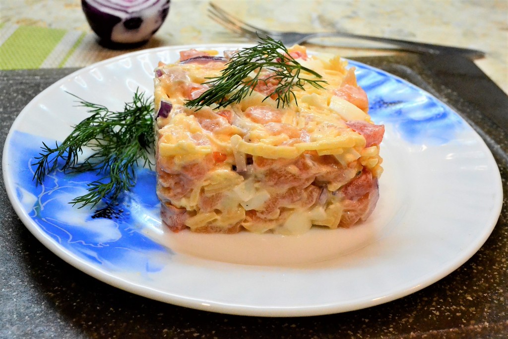 Вкуснейший салат, приготовленный с слабосолёной красной рыбой и помидором, подать к столу. И, поверьте, это блюдо точно понравится и вам, и вашим близким, и гостям!