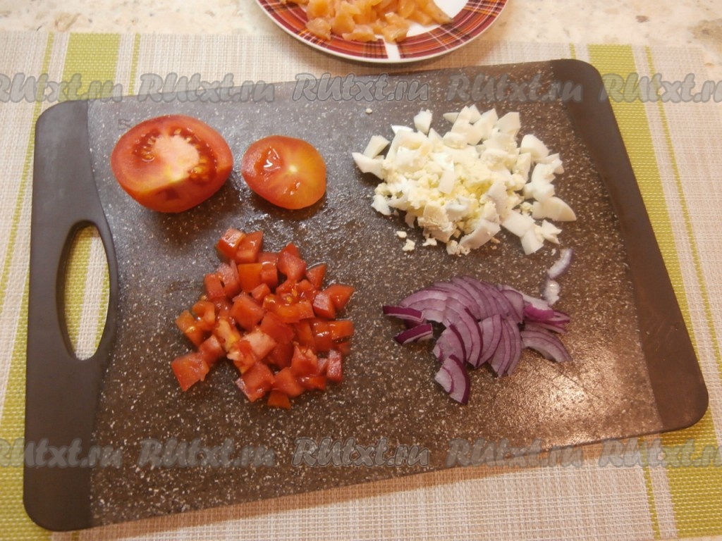 Помидор нарезать кубиками, яйцо нарезать достаточно мелко. Очищенный лук нарезать на тонкие четвертины (если у вас обычный репчатый лук, тогда обдайте его кипятком и дайте остыть).