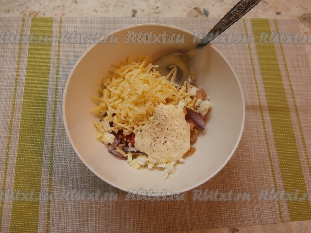 Красную рыбу, помидор, яйцо, сыр и лук поместить в миску, добавить в салат майонез, подсолить и поперчить, перемешать.