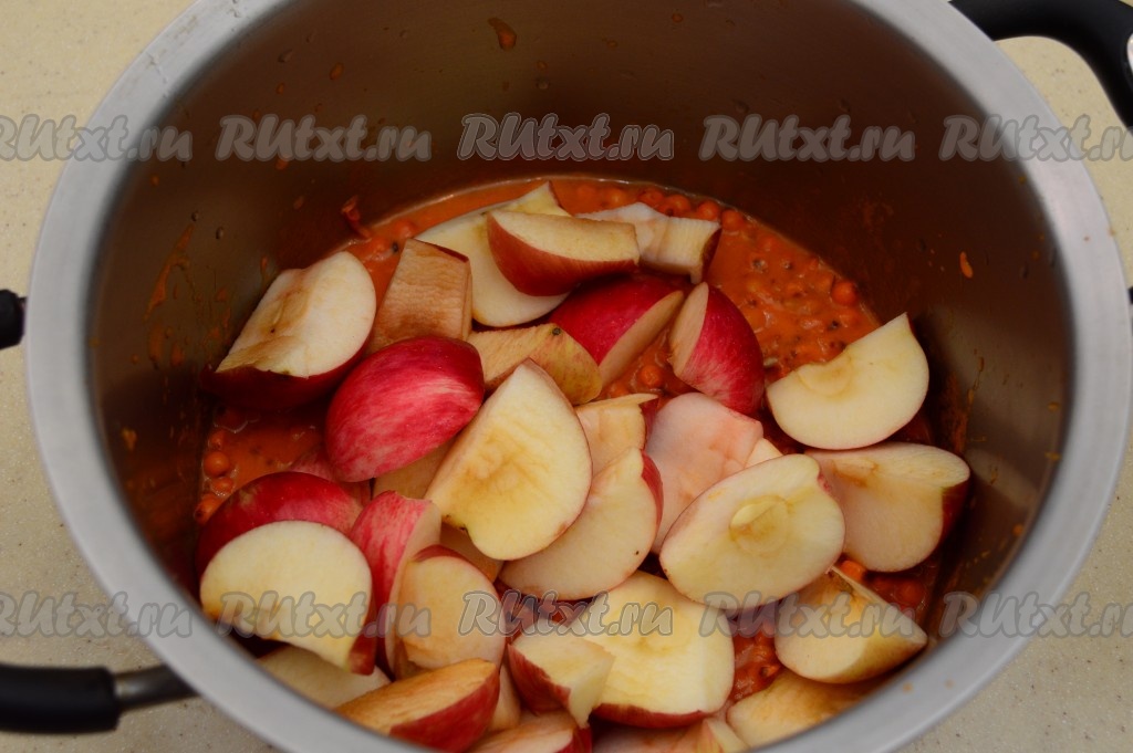 Яблоки нарезать на крупные дольки и выложить в кастрюлю с облепихой.