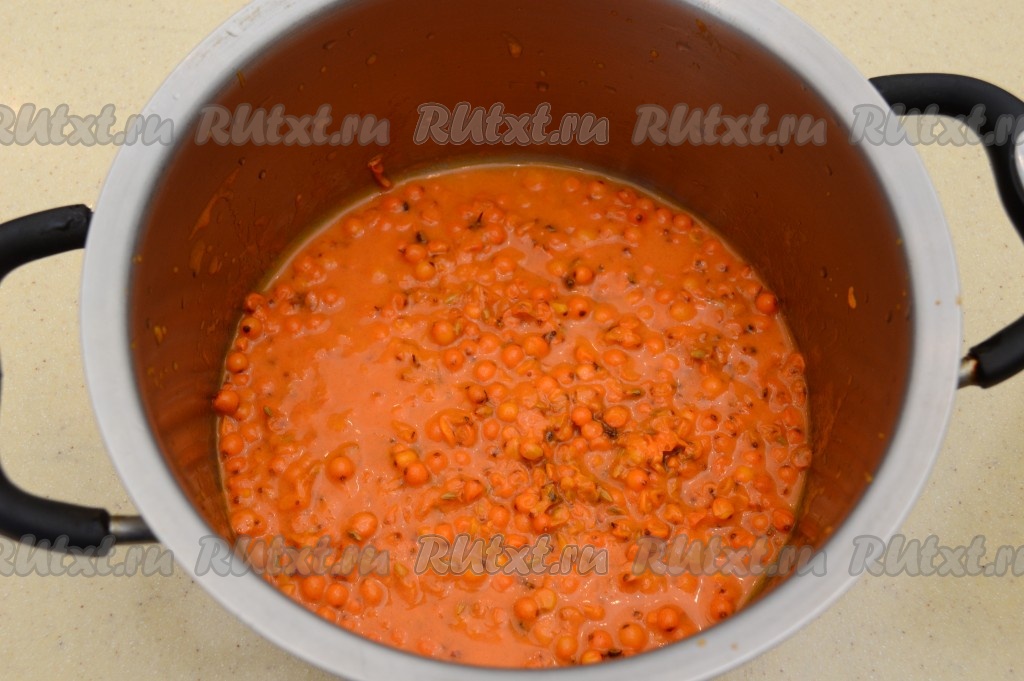 Всыпать облепиху в кастрюлю подходящего размера. Размять толкушкой, чтобы выделился сок. Все ягодки разминать не нужно.