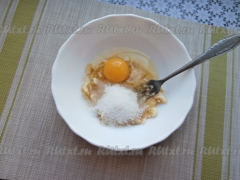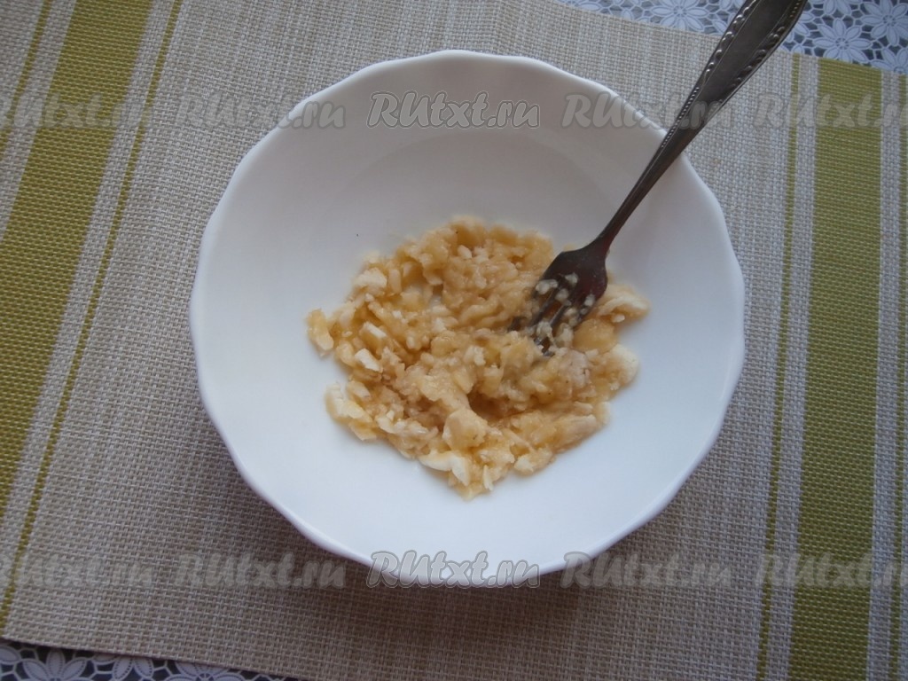 Переспевший, мягкий банан хорошо размять вилкой в достаточно глубокой тарелке.