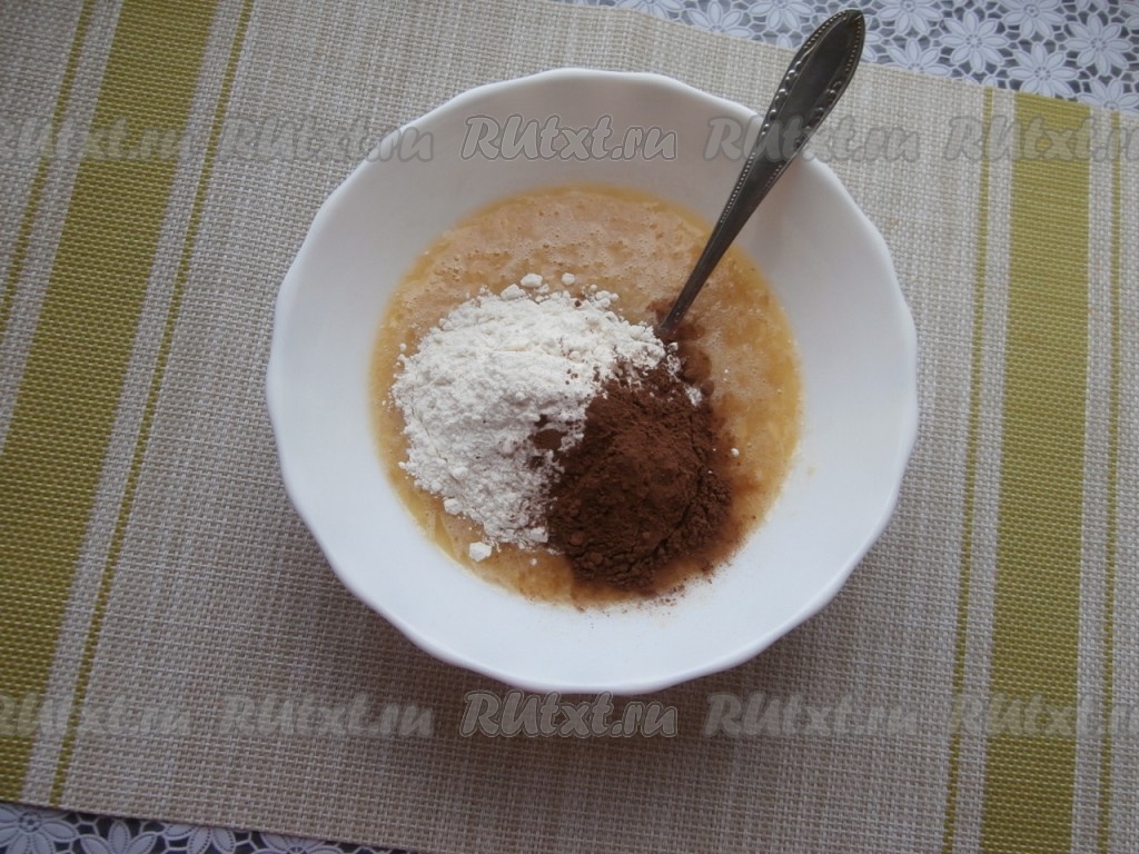 Далее добавить какао-порошок, муку и разрыхлитель.