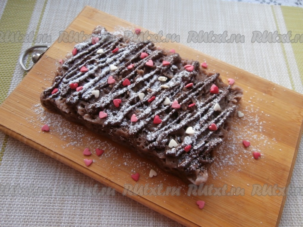 Готовый пирог аккуратно извлечь из формы, остудить, украсить растопленным шоколадом, сахарной пудрой и кондитерской посыпкой.