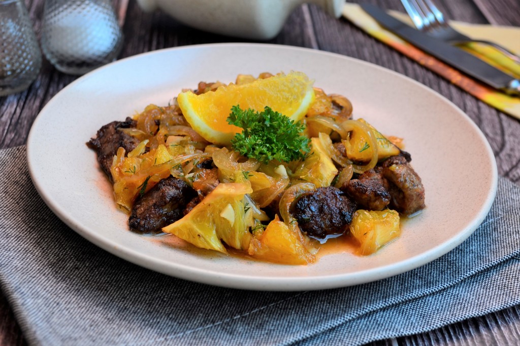 Ещё раз содержимое сковороды перемешать и подержать на минимальном огне 1-2 минуты. После чего снять с печени фольгу и выложить обжаренный лук с апельсинами сверху печени.
