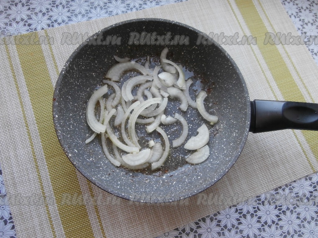 Лук очистить нарезать на достаточно тонки полукольца (или на четвертины). В сковороду влить оставшееся масло, выложить лук, обжарить его 2-3 минуты, иногда перемешивая, на среднем огне.