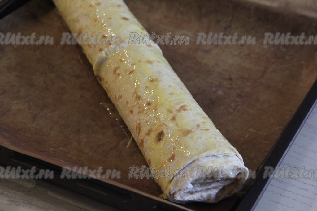 Немного подвернуть боковые края лаваша на начинку и свернуть лаваш в плотный рулет (у меня был очень длинный лаваш, поэтому я для формирования штруделя использовала только часть лаваша, смазанную начинкой, а чистую часть просто отрезала).