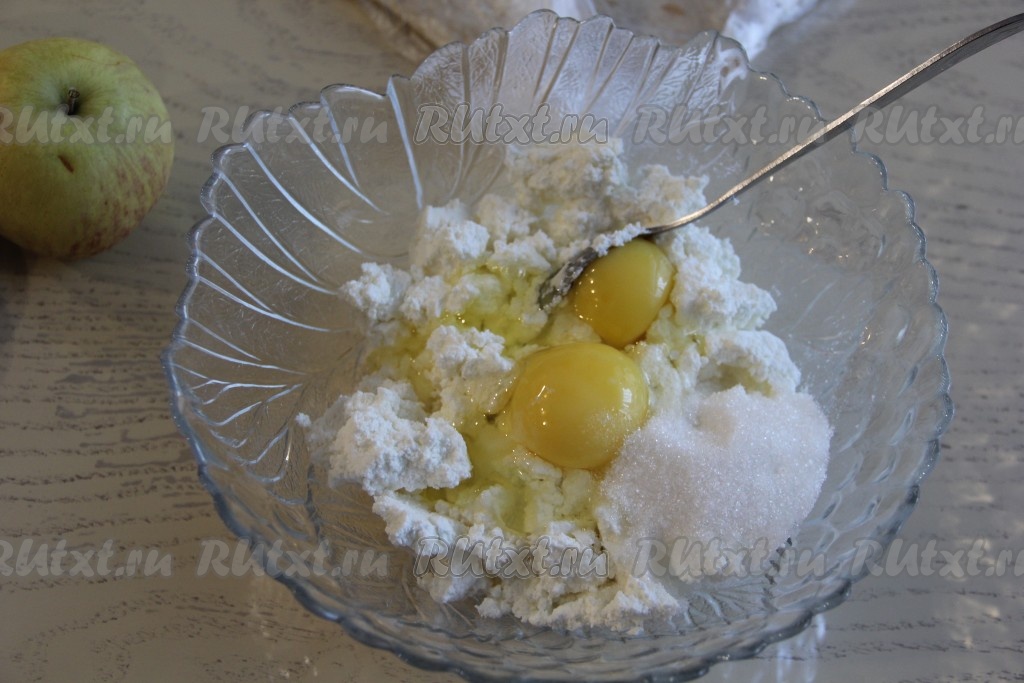 В миске соединить творог, яйца и сахар, перемешать творожную начинку для штруделя вилкой (или погружным блендером). Яблоки вымыть и нарезать на мелкие кубики (можно нарезать, не очищая от кожуры).