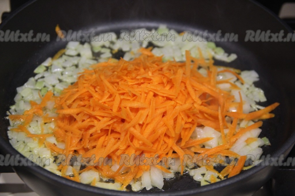 Вторую луковицу почистить. В сковороду с высокими бортиками влить немного масла, разогреть его, выложить мелко нарезанную луковицу, обжарить минуты 3-4 на среднем огне, помешивая, затём добавить натёртую морковку.
