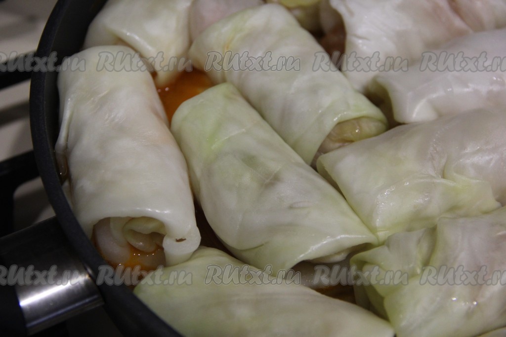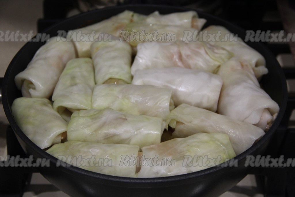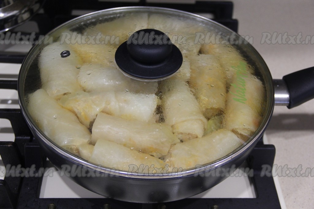 Накрыть сковороду крышкой и тушить голубцы с картошкой на среднем огне с момента закипания 40-45 минут.