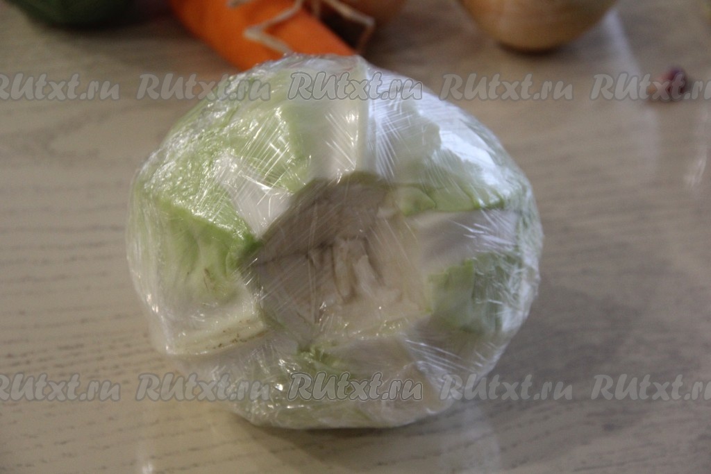 У кочана капусты вырезать кочерыжку. Теперь нужно размягчить листы капусты. Для размягчения можно поместить кочан в глубокую кастрюлю, затем залить его водой так, чтобы она немного покрывала капусту, отправить на огонь, после закипания проварить 4-5 минут, затем достать кочан, мягкие листы отделить от кочана, а оставшиеся листья поместить в ту же воду и отварить до мягкости. Я решила размягчить капустные листы в микроволновке - это намного быстрее, чем варить в кастрюле, для этого выложить кочан в полиэтиленовый пакет (или обернуть его в пищевую плёнку), поместить в микроволновку и готовить на максимальной мощности минут 10, затем развернуть плёнку и снять размягчившиеся листики капусты.