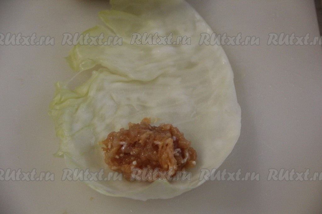 На подготовленный лист капусты выложить немного начинки и сформировать голубец, подвернув вначале боковые края капустного листа на начинку, а затем свернуть лист рулетиком. Я делала небольшие голубцы из половинок листа и у меня получилось 16 голубцов.