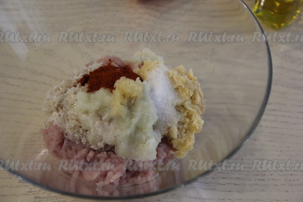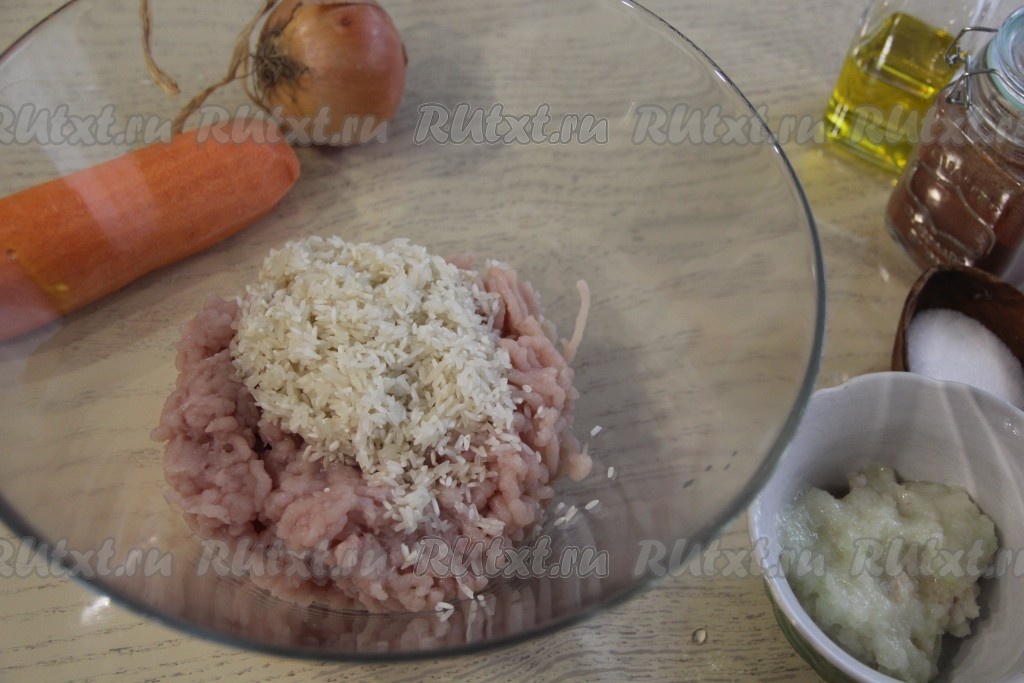 Рис предварительно следует хорошо промыть, лишней воде дать стечь. Выложить в миску фарш, добавить промытый рис.