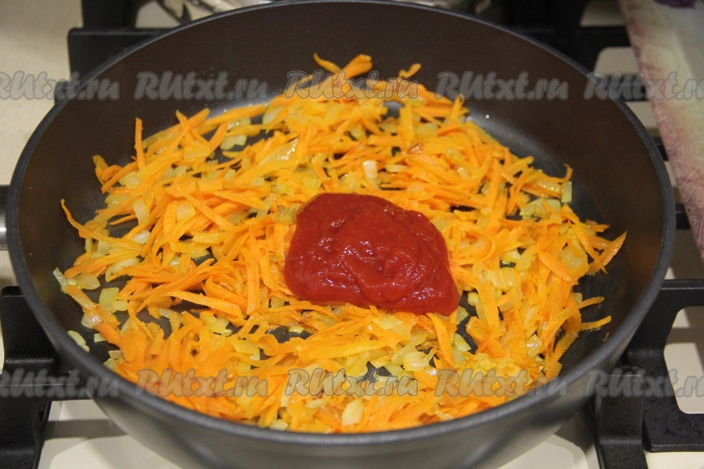 Обжарить овощи в течение 5 минут, иногда перемешивая, после этого добавить к ним томатную пасту, посолить и перемешать.