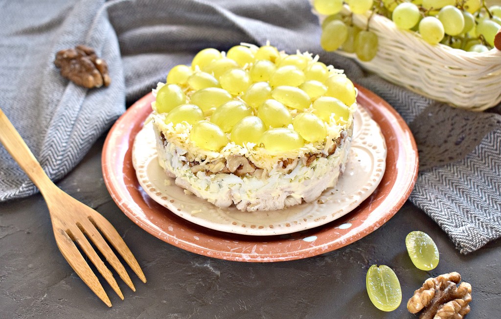 Этот слоёный салат, приготовленный с виноградом, курицей, грецкими орехами и сыром, точно не останется без внимания гостей, собравшихся за праздничным столом. По сути, это один из вариантов известного многим салата "Тиффани". Виноград выкладывается сверху салата завершающим слоем, поэтому блюдо получается очень аппетитным. В этом салате очень удачное сочетание ингредиентов, которое создаёт гармонию вкуса. Этому нежному, красивому салату обязательно нужно дать постоять в холодильнике хотя бы в течение 30 минут, чтобы все слои хорошо пропитались.