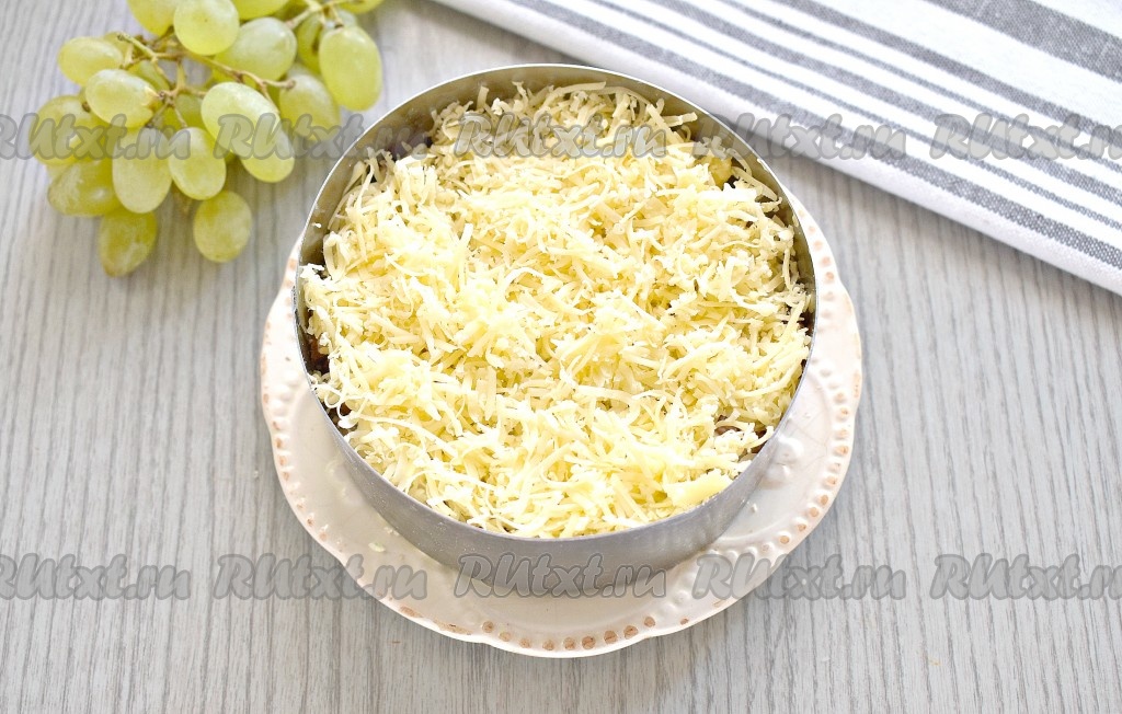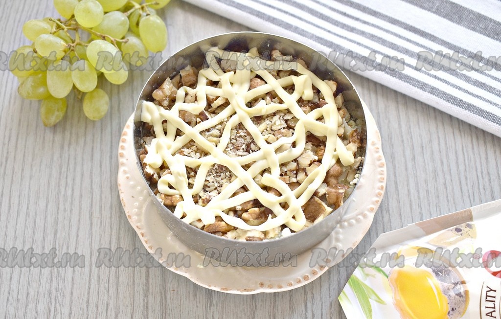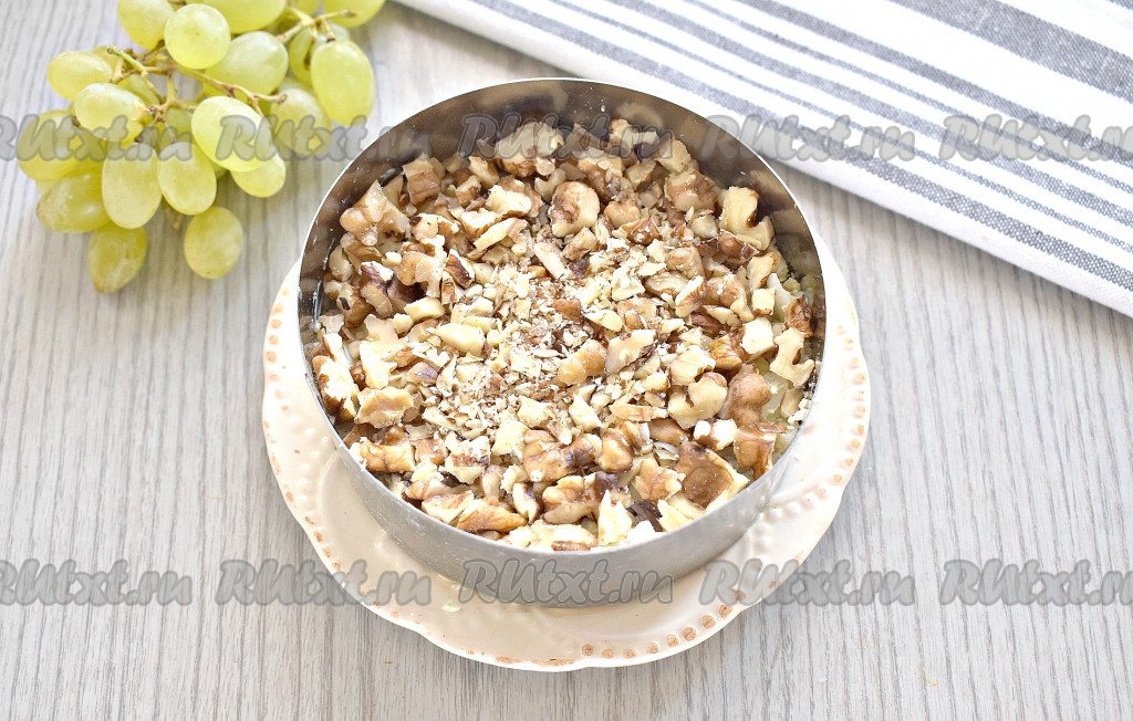 Вкусный, аппетитный, сочный слоёный салат с виноградом, грецкими орехами, курицей и сыром готов, можно подавать к столу.