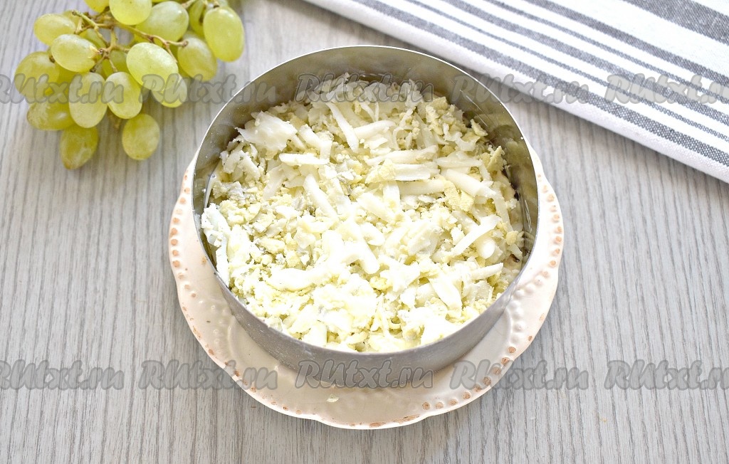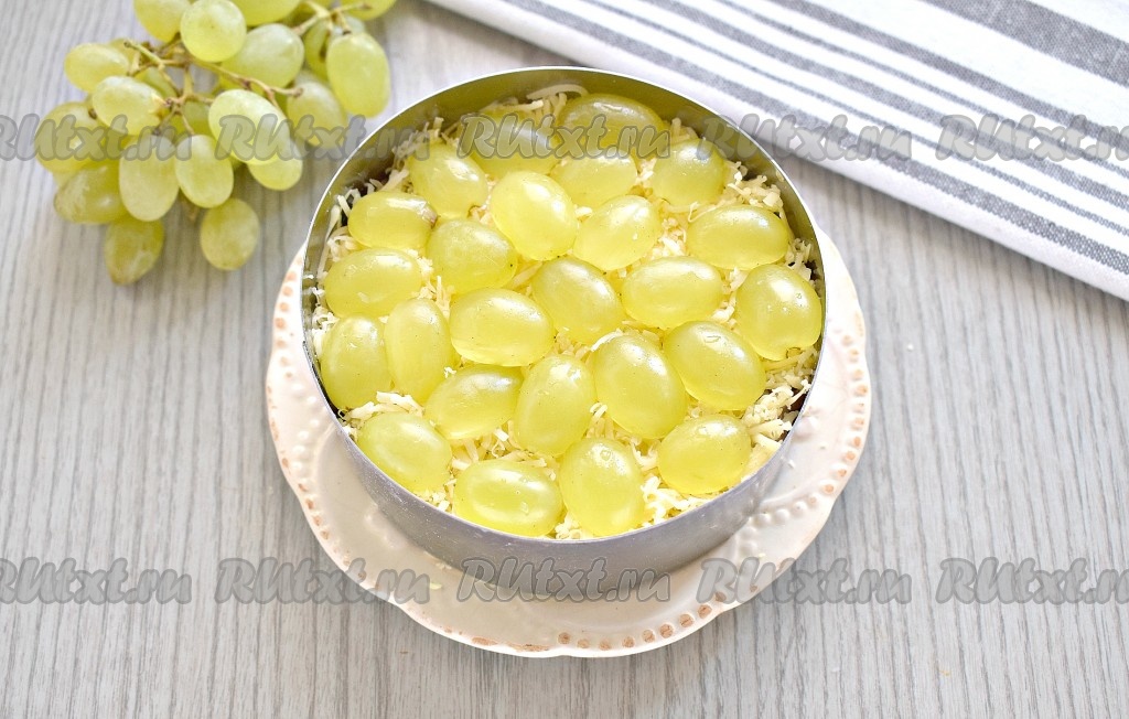 Промываем виноград. Разрезаем каждую виноградинку на две половинки. Если есть косточки, то обязательно удаляем их. Украшаем салат сверху виноградом и отправляем его настаиваться в холодильник, как минимум, на 30 минут.