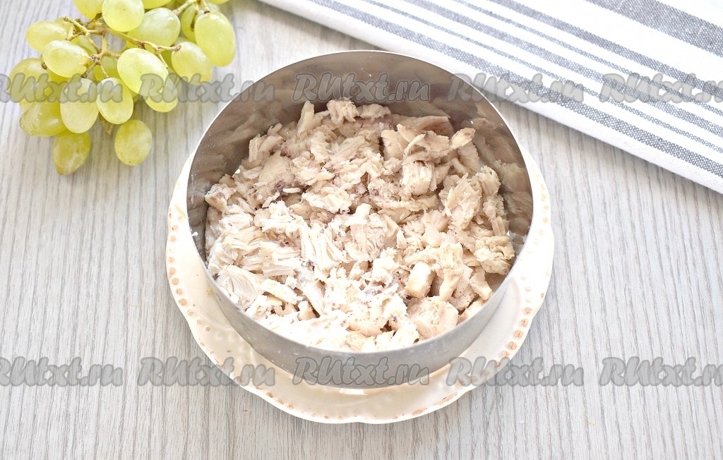 Куриное мясо (я взяла куриное филе, можно взять филе бедра) отварить в подсоленной воде в течение 30 минут с момента закипания воды. Отварить яйца вкрутую (на отваривание с момента начала кипения воды потребуется минут 8-10), а затем остудить их в ледяной воде и очистить. Для сборки блюда я использовала сервировочное кольцо, поставив его на плоскую тарелку, но подойдёт и прозрачный салатник. Итак, остывшее куриное мясо нарезаем на мелкие кусочки и выкладываем первым слоем.