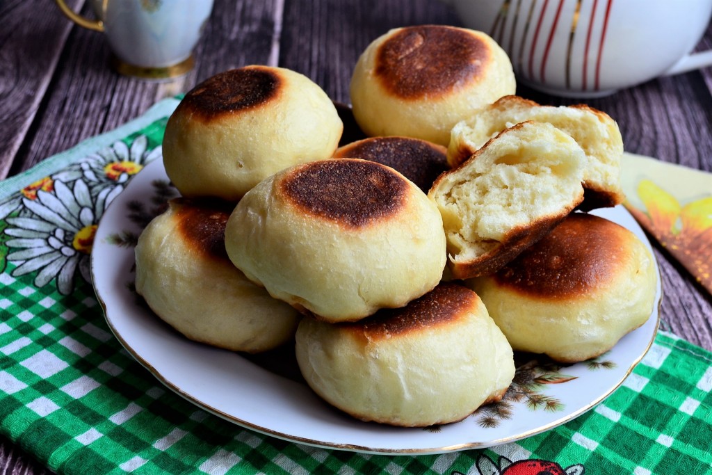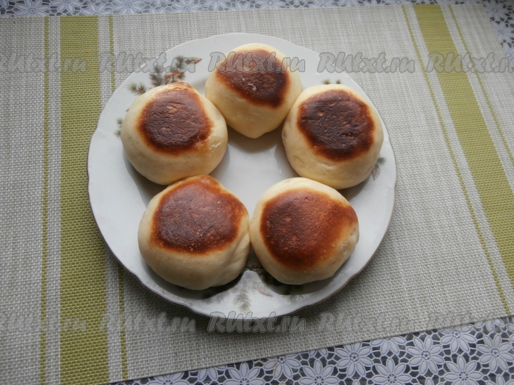 Готовые булочки выложить на тарелку и дать им остыть. Аналогично испечь на сковороде все булочки.