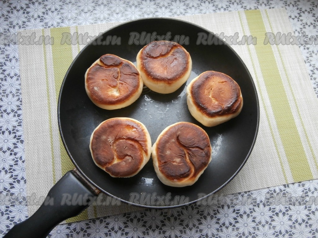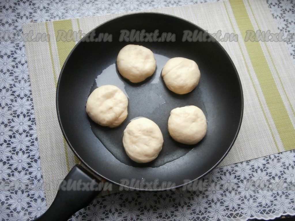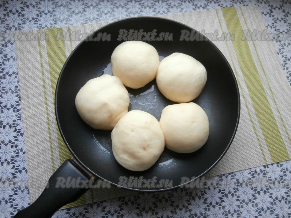 Сковороду разогреть с растительным маслом, огонь сделать минимальным. Выкладывать дрожжевые булочки на сковороду, немного приплюснув их рукой. Готовить булочки частями, под закрытой крышкой, примерно, 10-12 минут.