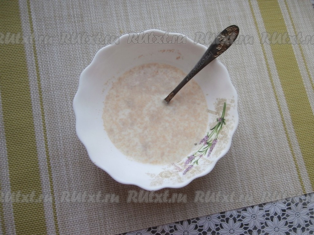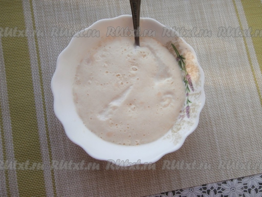 Хорошенько перемешать, накрыть опару плёнкой и оставить в тёплом месте на 10-15 минут (до образования характерной "шапочки").