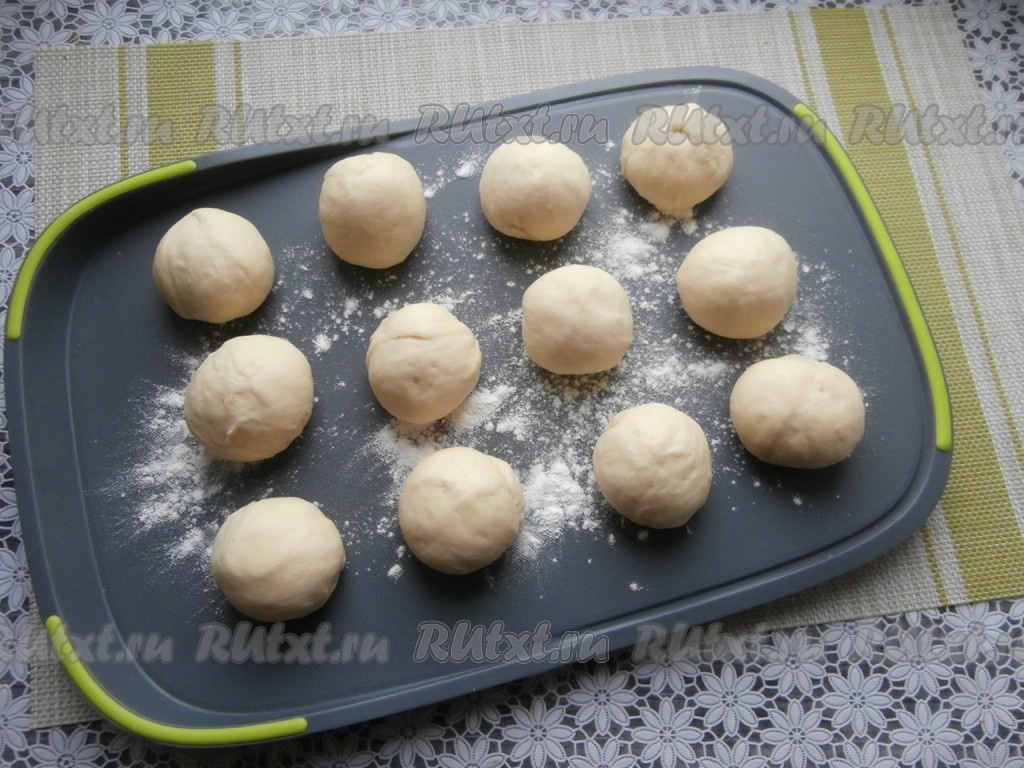 Затем тесто обмять, поместить в целлофан и отправить в холодильник на пару часов. После этого разделить тесто на 12 частей, каждую - скатать в шарик.